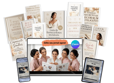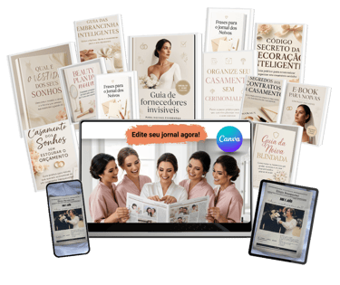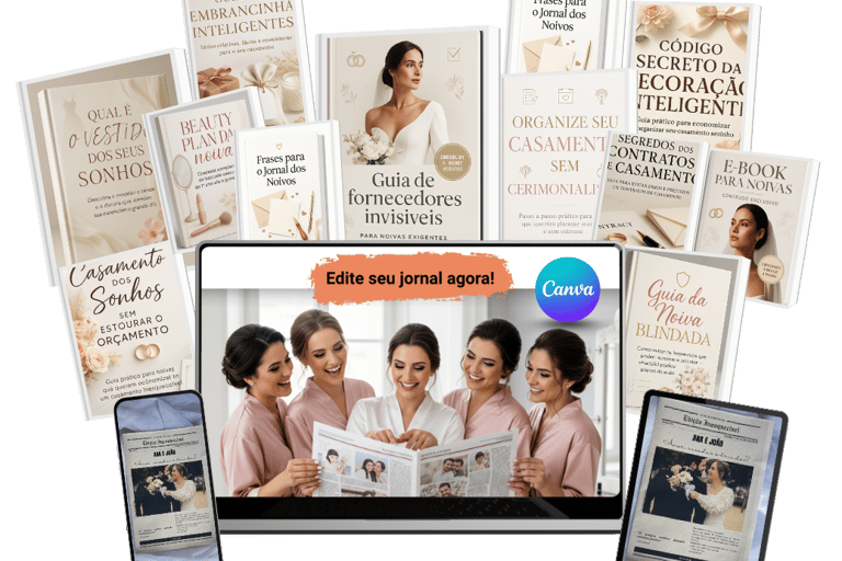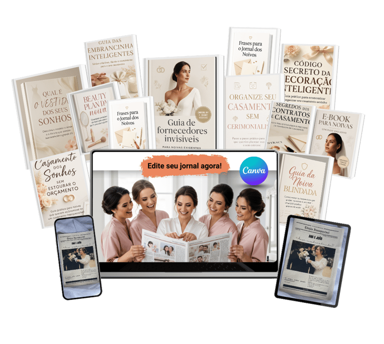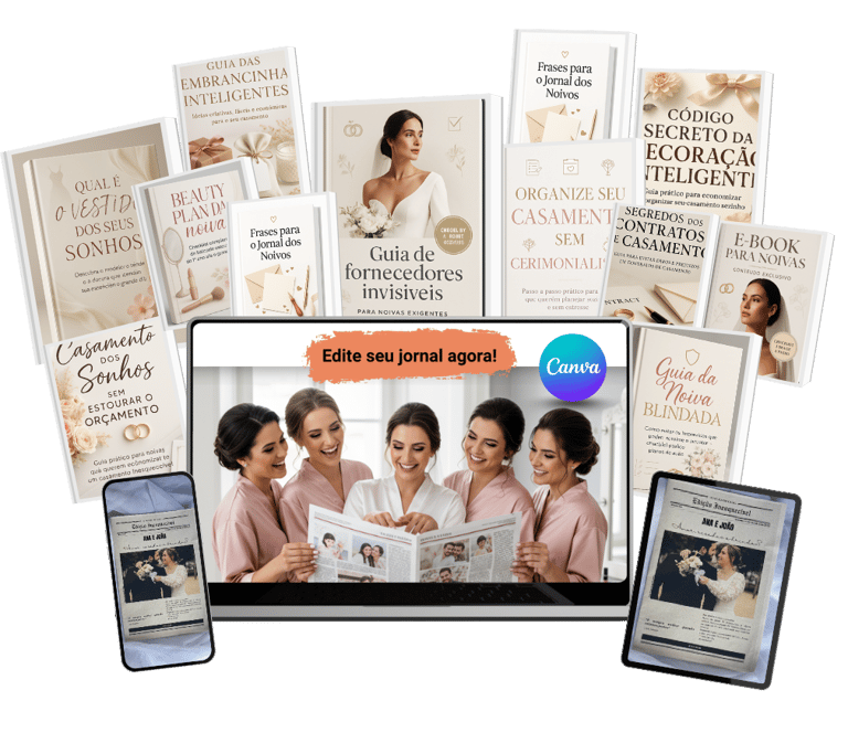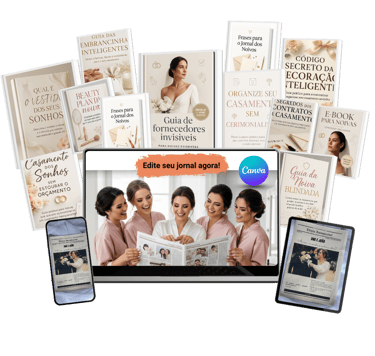 O Jornal de Casamento Editável e + DE 10 BÔNUS EXCLUSIVOS que vão facilitar a sua vida, economizar seu tempo e te ajudar a planejar um casamento lindo sem precisar de cerimonialista.